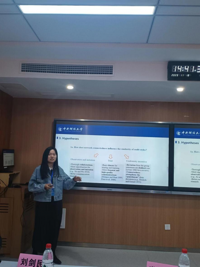 应江西财经大学会计发展研究中心邀请,20231118日下午,中央财经大学助理教授王林在第届赣江国际会计论坛平行分会场九上报告了最新的研究论文Network Connectedness and the Convergence of Audit Styles”。平行分会场由江西财经大学廖义刚教授与曹玉珊教授主持,南昌大学刘剑民教授、黄承浩讲师、江西财经大学邓晨芳博士生、上海财经大学李淦冰博士生及其他师生共同参与了本平行分会场。