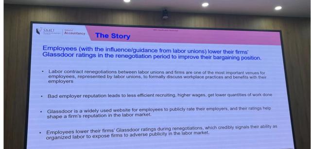张连栋教授从研究动机、理论分析、研究设计、研究结果、研究结论与贡献五个方面进行了论文报告。首先,员工福利是全世界共同关注的社会责任问题,本文利用Glassdoor美国公司员工评价数据,探讨劳动合同到期前,工会发起员工谈判是否会影响公司评级?随后,张连栋教授进行了理论分析。现有研究表明,投资人,求职人员和企业高管进行决策时越来越重视社交媒体发布的信息(Campbell and Shang,2021;Farhadi and Nanda,2021)。Glassdoor 作为美国一家做企业点评与职位搜索的职场社区,员工可以在Glassdoor上匿名点评公司,包括其工资待遇、职场环境、面试问题等信息。差的雇主声誉会导致企业招聘效率下降、薪酬成本提高及工作任务质量降低,因此,美国企业重视员工在Glassdoor发布的评价信息。与此同时,合同谈判期间员工降低了企业在Glassdoor的评级水平,向企业传递了一个有效的信号,即工会有能力组织员工发布消极评价致使企业在劳动力市场面临困境。