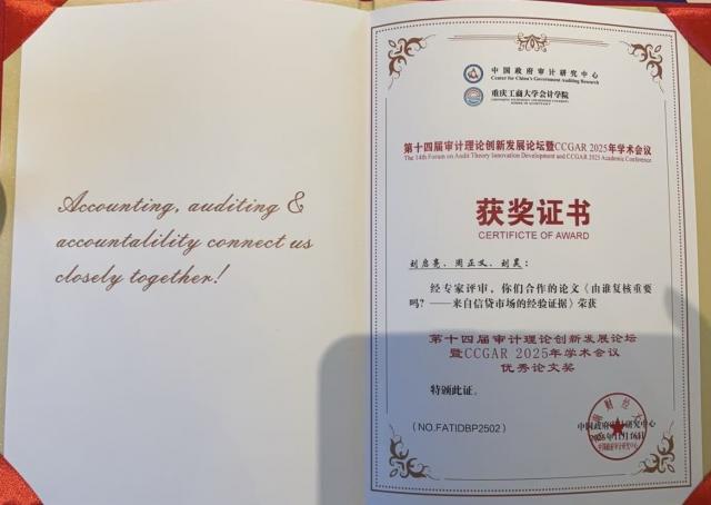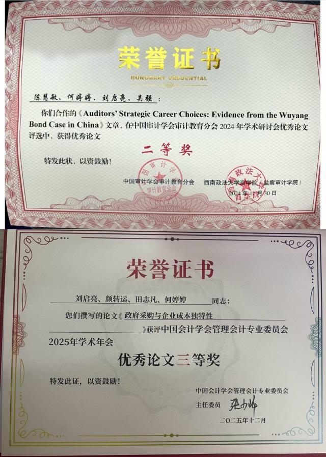 刘启亮教授与何婷婷博士参与合作的论文中,《To leave or not to leave: Auditors' career choices during accounting firmcrises》一文在《中国会计评论》理事会主办的第二十四届中国实证会计研讨会中荣获优秀论文奖;《Auditors' Strategic Career Choices: Evidence from the Wuyang Bond Case inChina》一文在中国审计学会审计教育分会2024学术研讨会优秀论文评选中荣获优秀论文二等奖;《To Leave or to Stay During a Crisis: Auditors' CareerChoices》一文在中国会计学会会计教育分会2025年学术年会上获评优秀论文;《政府采购与企业成本独特性》一文在中国会计学会管理会计专业委员会2025年学术年会中荣获优秀论文三等奖。此外,刘启亮教授参与合作的《由谁复核重要吗?——来自信贷市场的经验证据》在第十四届审计理论创新发展论坛暨CCGAR2025年学术会议中荣获优秀论文奖。