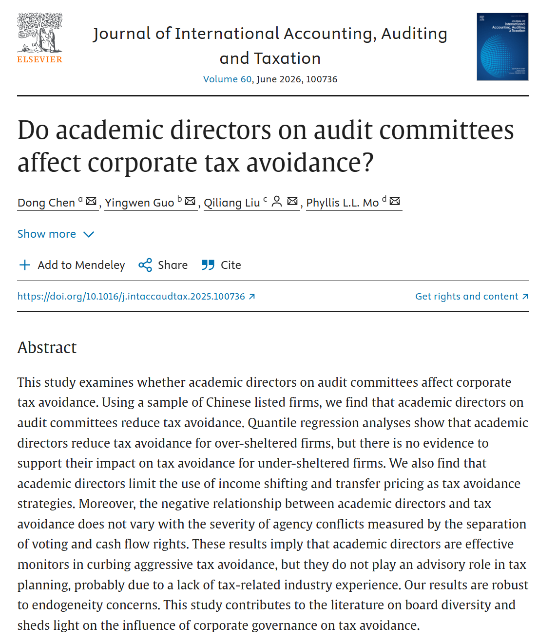 近期,会计学院刘启亮教授的合作论文《Do academic directors on audit committees affect corporate tax avoidance?》被国际期刊 《Journal of International Accounting, Auditing and Taxation》 接受并在线发表。该期刊由 Elsevier 出版,为ABS三星期刊,是国际会计、审计与税收领域具有重要影响力的学术期刊之一。