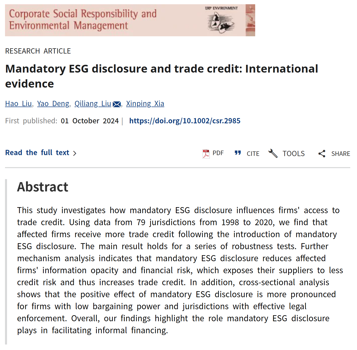 近期,会计学院刘启亮教授的合作论文《Mandatory ESG disclosure and trade credit: International evidence》被国际期刊 《Corporate Social Responsibility and Environmental Management》 接受并在线发表。该期刊由 John Wiley & Sons 出版,是企业社会责任与可持续发展研究领域的重要国际学术期刊之一。期刊被 Social Sciences Citation Index(SSCI) 收录,在 Journal Citation Reports(JCR) 中属于管理学领域 Q1 区期刊,同时在Academic Journal Guide (ABS) 评级体系中被评为 2星期刊,在国际管理与可持续发展研究领域具有较高学术影响力。