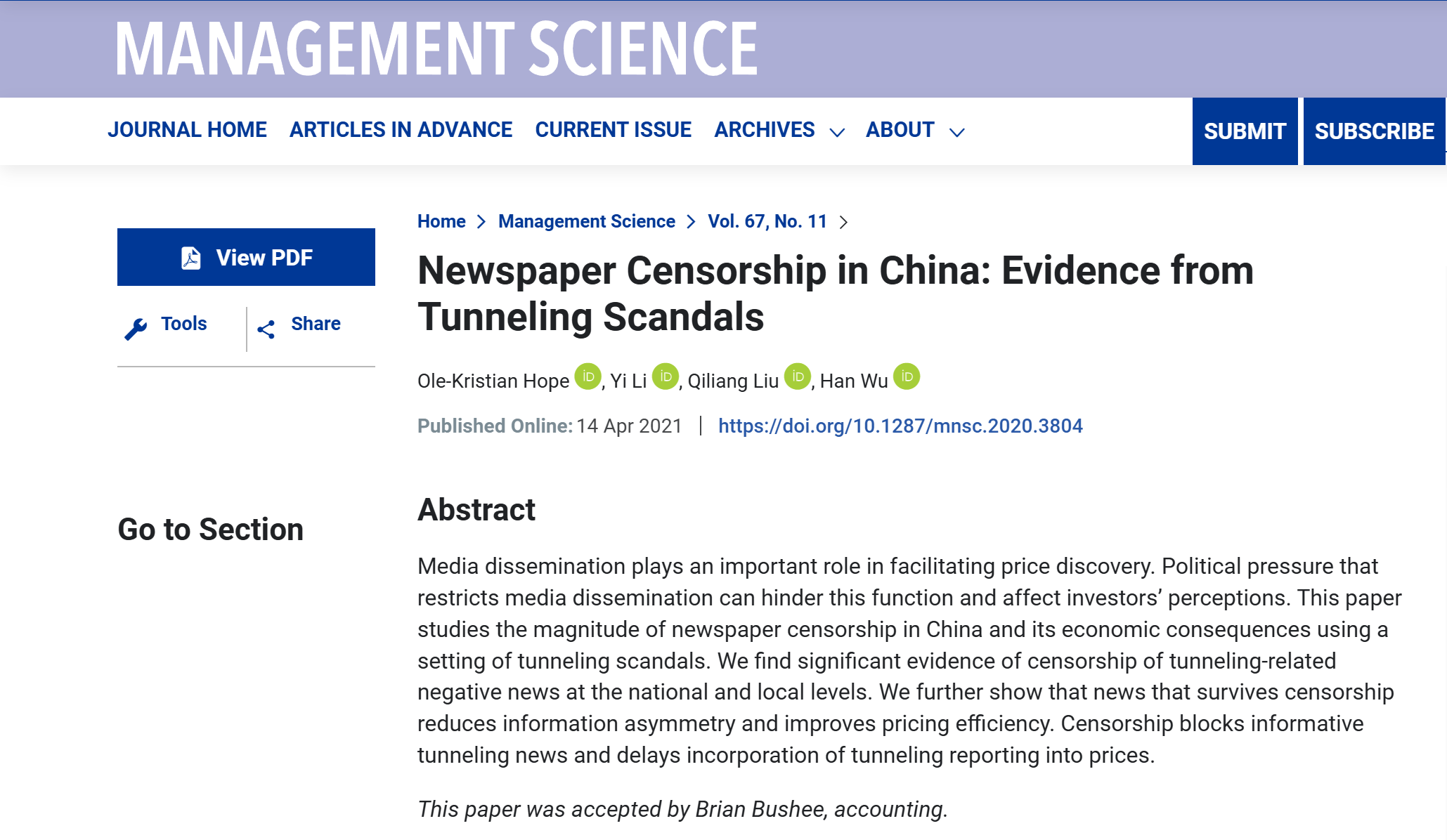 近日,会计学院刘启亮教授与多伦多大学著名教授Ole‑Kristian Hope等合作研究的论文Newspaper Censorship in China: Evidence from Tunneling Scandals在管理学领域UTD24期刊《Management Science》上发表。