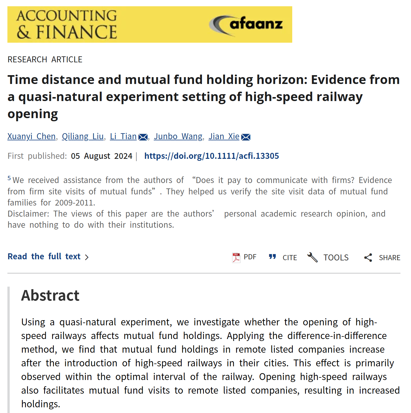 近期,会计学院刘启亮教授的合作论文《Time distance and mutual fund holding horizon: Evidence from a quasi-natural experiment setting of high-speed railway opening》在国际学术期刊《Accounting & Finance》正式发表。该期刊被 Social Sciences Citation Index(SSCI)收录,在Journal Citation Reports(JCR)中属于 Business, Finance学科Q2区期刊;同时在 Academic Journal Guide (ABS) 评级体系中被评为2星期刊,在国际会计与金融研究领域具有较高学术影响力。