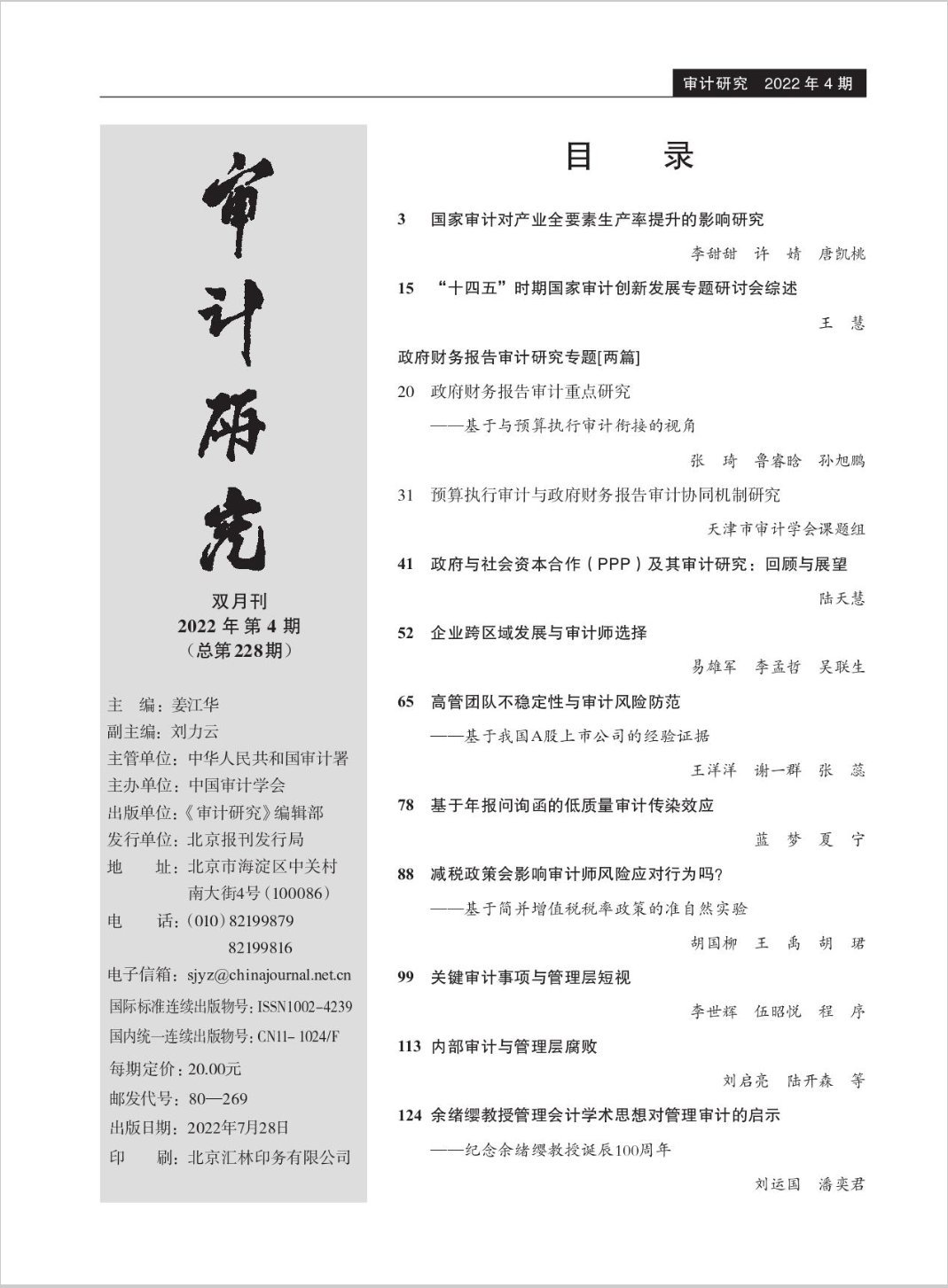 《审计研究》是审计学领域具有重要影响力的专业学术期刊,长期聚焦审计理论、审计实务及相关治理问题研究,刊载审计与监督领域的重要学术成果,在推动我国审计理论创新与实践发展、服务国家治理体系和治理能力现代化方面发挥了积极作用。