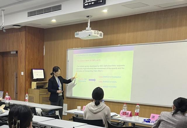 1118下午第二届赣江国际会计论坛第一平行分会场的学术交流会在第三教学楼举行。会上,华中科技大学的高茹教授报告了最新的研究论文Unveiling Asymmetry in CSR Performance Effects on SEC Enforcement: Evidence from Non-public Data”。平行分会场一由武汉理工大学的洪荭教授与华中科技大学的高茹教授共同主持,香港中文大学的邓恬助理教授、中南财经政法大学的李丽博士研究生、湖南大学的朱宣凝博士研究生以及众多专家学者及研究生到场聆听