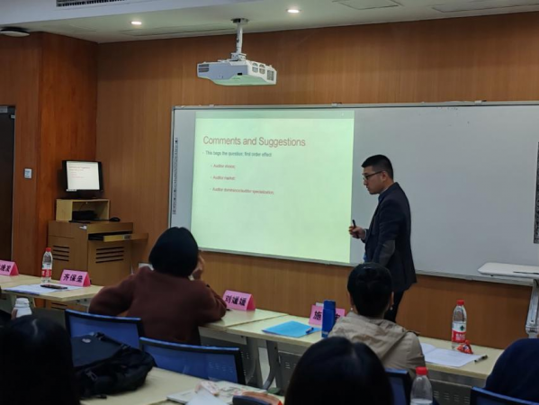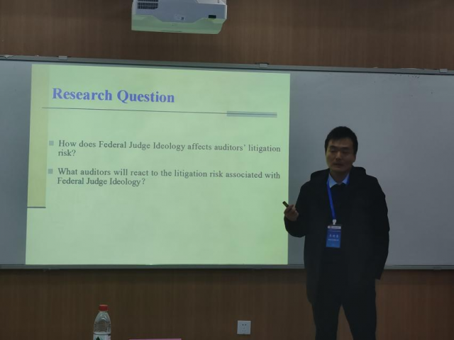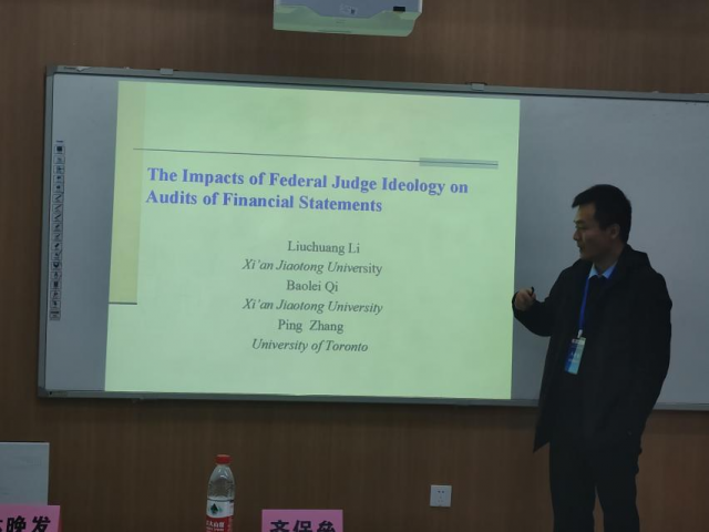 应江西财经大学会计发展研究中心邀请,11月18日下午,来自西安交通大学的齐保垒教授在第二届赣江国际会计论坛第三平行分会场上报告了最新研究论文“The Impacts of Federal Judge Ideology on Audits of Financial Statements”。平行分会场三由武汉大学林晚发副教授和厦门大学的刘媛媛副教授主持,华中科技大学施汉忠讲师、华中科技大学的田志凡博士生、南京审计大学周正义硕士生及其他国内外师生共同参与了本平行分会场。