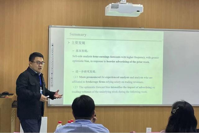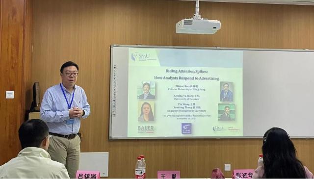 11月18日下午,第二届赣江国际会计论坛第六平行分论坛在第三教学楼107教室举行。来自新加坡管理大学的王胤副教授在论坛第三平行分会场上报告了最新研究论文“Riding Attention Spikes:How Analysts Respond to Advertising”。分论坛由江西财经大学会计学院副院长熊凌云教授和江西农业大学张征华教授主持,东北财经大学许浩然副教授、南开大学赵乐助理教授、江西财经大学吕锦鹏讲师以及其他师生共同参与了本平行分会场。